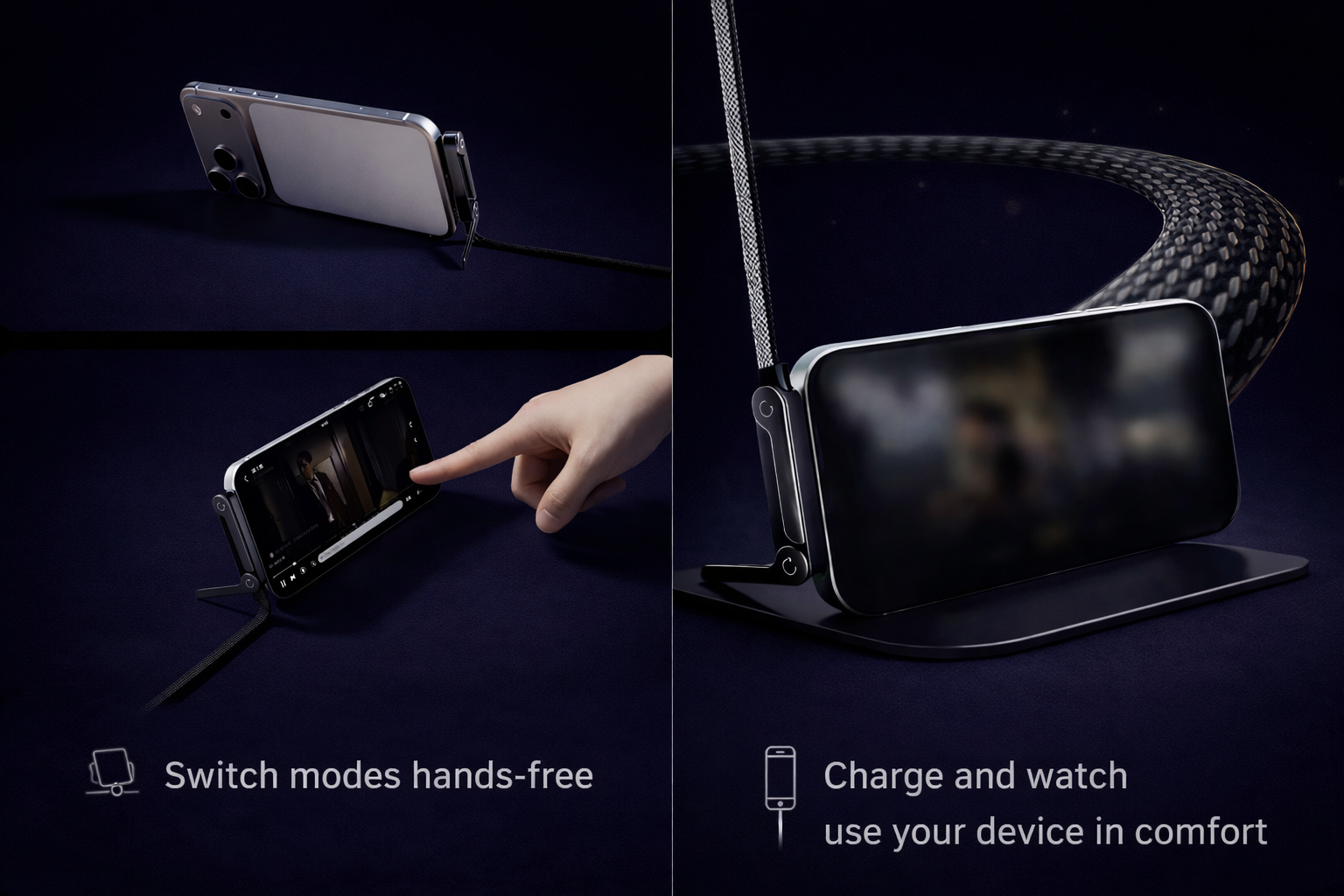 Charge, watch, scroll, or game—hands-free. The integrated stand adapts to your setup at home, at your desk, or on the go.